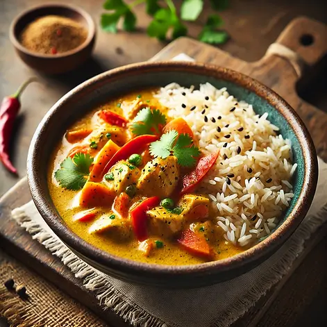 Paprika und Karotten dazugeben, mit Kokosmilch auffüllen und 10 Min. köcheln lassen.